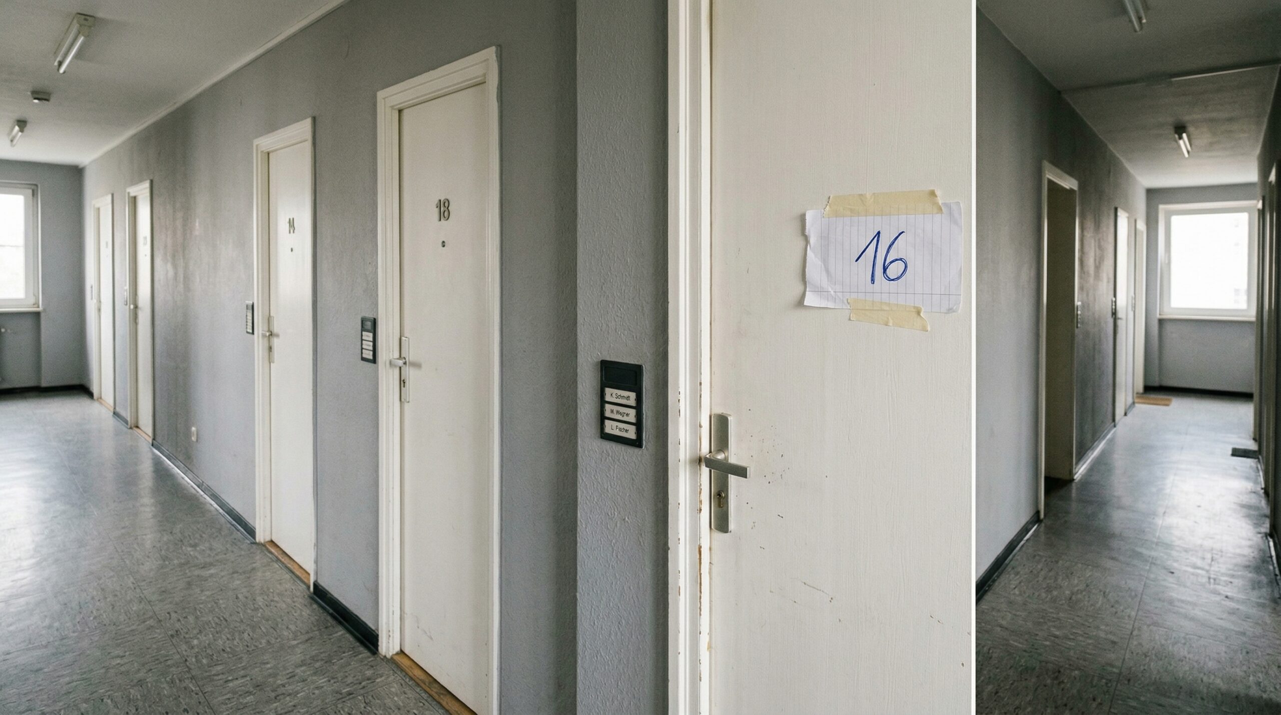 Provisorische, handgeschriebene Nummer 16 auf einem Papierstreifen an einer anonymen Wohnungstür in einem schlichten Flur.