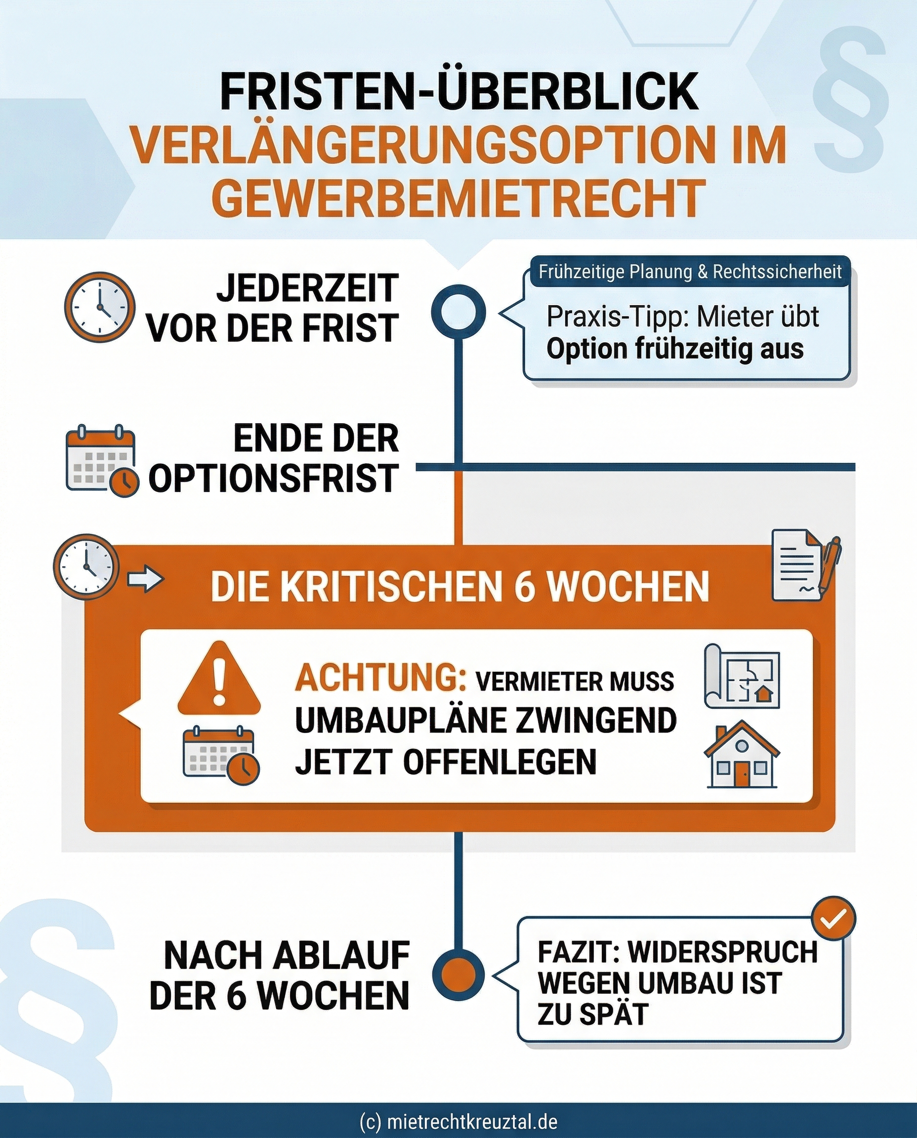 Der entscheidende Hebel dieses Urteils war die verspätete Reaktion des Vermieters. Falls Ihr Vertrag die Option bei Umbauplänen einschränkt, muss der Vermieter diese Pläne typischerweise innerhalb von etwa sechs Wochen nach Ablauf Ihrer Optionsfrist offenlegen. Prüfen Sie bei einem Widerspruch genau das Datum: Erfolgt die Mitteilung der Umbauabsicht erst viele Monate nach Fristablauf, ist sie rechtlich meist wirkungslos.